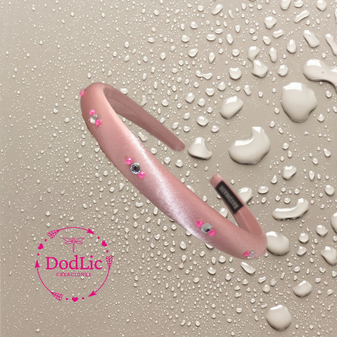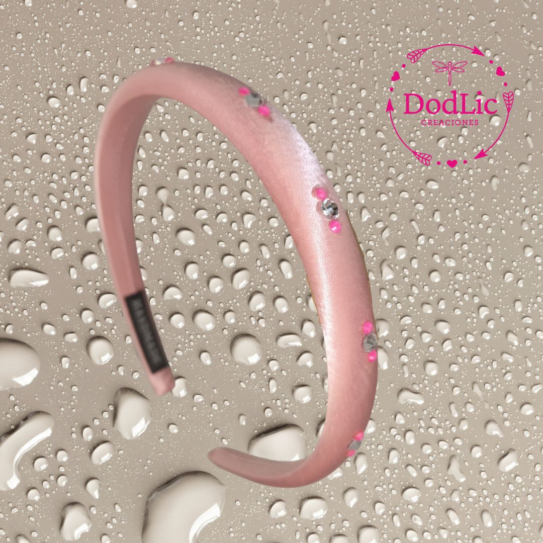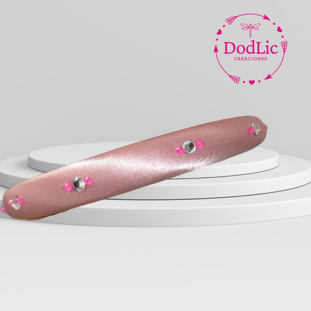 Descubre la armonía de nuestro cintillo Chispa Divina, semi-acolchado con un calce cómodo, pero ajustado. Forrado en satín rosado brillante, el cual resalta aún más con con la fina decoración que otorgan 7 cristales de 4.8mm color Crystal plata, cada uno flanqueado por dos cristales color rosa eléctrico de 2.7mm., todos auténticos y genuinos de Aurora, separados por 3cm entre sí.